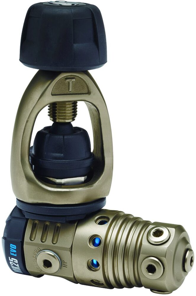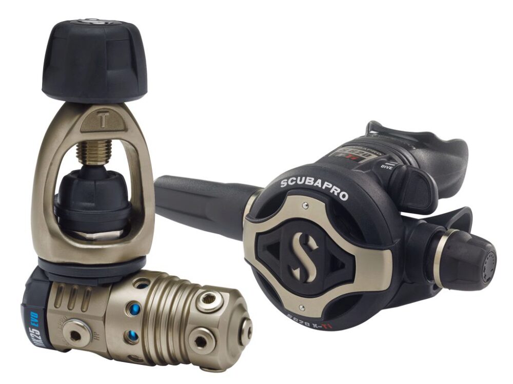 SCUBAPRO’s top regulator technology is on display in this high-tech, ultralight reg system. The MK25T EVO is machined from a solid block of titanium which will not corrode, even in concentrated saltwater conditions, promising years of trouble-free use. It offers excellent resistance to freezing, superb inhalation sensitivity and instant delivery of air on demand. The new S620 X-Ti embraces the best features of SCUBAPRO’s renowned S600 in an upgraded, state-of-the-art design. Smaller and lighter but using the same-sized diaphragm, the S620 X-Ti delivers effortless airflow under all dive conditions. The titanium inlet tube is super-efficient, the large purge button improves water circulation and the new exhaust tee enhances overall performance.